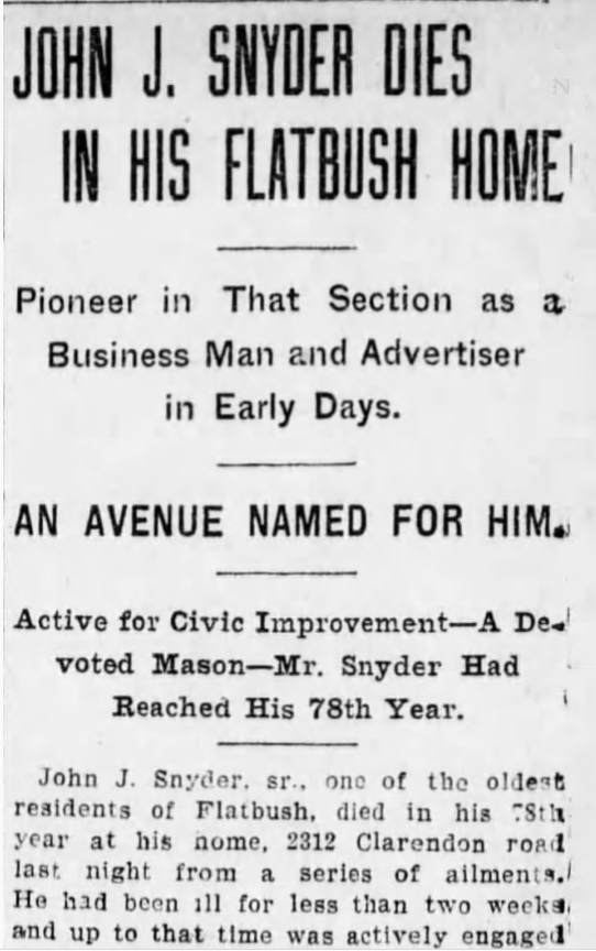 “Enright, I’m sick of your memories, I need some Brooklyn history…Wait, here’s something! It says in this 1946 Times obit that John Jacob Snyder was buried in Green-Wood as the ‘Mayor of Flatbush’ but I never heard of him. See what you can dig up!”