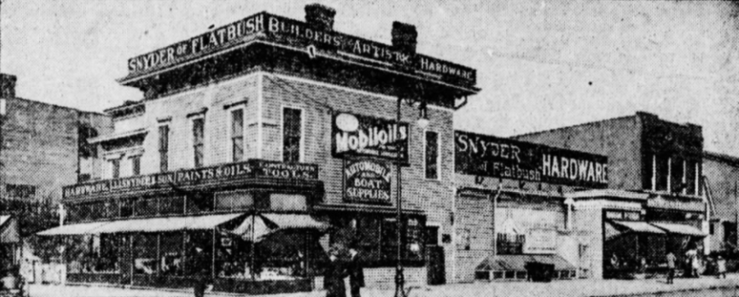 In 1871 John Jacob Snyder created a small carpentry/hardware shop a block south and a block east of the old Dutch church, at the corner of Locust Street & Union Place. Four years later Union Place was renamed Grant Street to honor the sitting President, General Ulysses S. Grant. As the years passed and the population of Flatbush grew, John J. Snyder successfully pushed for the southward extension of Bedford Avenue down from Crown Heights to obliterate the miniscule Locust Street. And then in 1904, as Snyder grew long in the tooth, and as his hardware store prospered, the commercial powers that be decided that Grant, dead now for almost 20 years, should bow to progress and Grant Street was renamed Snyder Avenue.