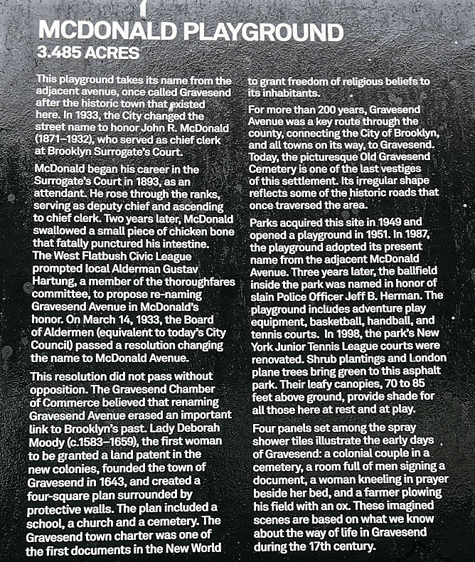 This time the graves were close to Flatbush, just inside the Fort Hamilton Parkway entrance, near Gravesend Avenue…oops…Gravesend was renamed McDonald Avenue in 1933 to honor a 40-year veteran of the Brooklyn Surrogate Court who was killed by a chicken bone. Residents and businesses from Park Slope to Coney Island were against the change, but back then it was Tammany Rules. By all accounts John McDonald, who lived five blocks east of Gravesend Avenue, was a kind, decent, charitable man. But honoring him wiped out a street name that had stood for 267 years. I mean, Nathan Hale rode down Gravesend! Why not rename East 5th Street instead? Apparently, the clinching argument was that “Gravesend” was “too morbid a name.” Wow.