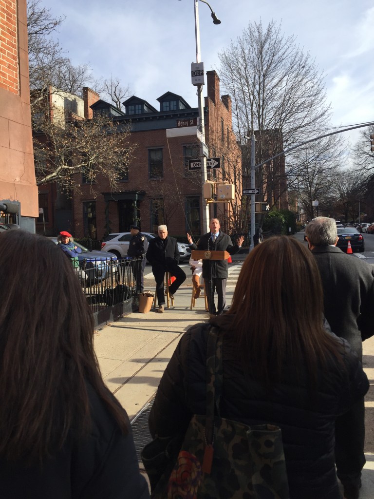 Suddenly Comptroller-elect Brad Lander was at the lectern, feeling nostalgia for all the street re-namings he’s attended over the past twelve years, followed by Councilmember Dominic Recchio apologizing for this renaming taking three years to accomplish, and then Mayor DeBlasio was there, towering over Mary’s daughter, Carmela. As he droned on, I wondered if Henry Street had originally been named for the Oh Henry! candy bar. I pulled out an almost obsolete iPhone 6 and learned the ground on which we all stood had been named for Thomas Henry, a prominent physician in the 1820s who treated the early aristocracy of Brooklyn Heights. Next I tried DeGraw Street: named for a 1700s land-owner.
