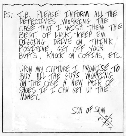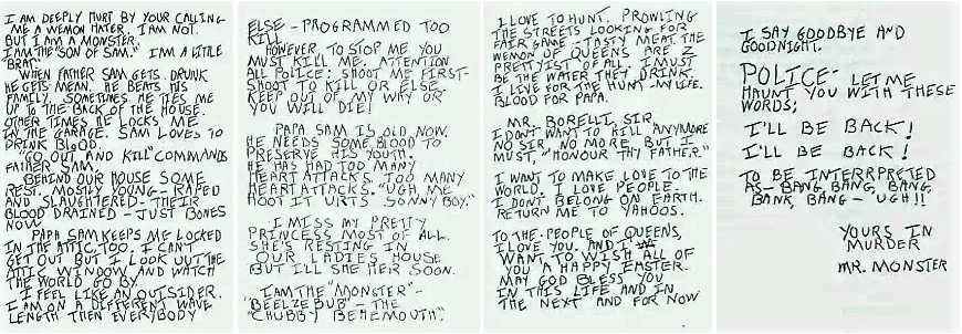 Then on June 5th, Jimmy Breslin’s Sunday column in the Daily News began with a letter he’d received from the .44 Caliber Killer: “Hello from the gutters of NYC…Hello from the sewers of NYC.” OK, that’s interesting, I thought, the whole sewers thing. And the grammar and spelling were impeccable. However, Charlie could not be the Son of Sam, I assured myself, desperately trying to banish the thought of being featured in an upcoming Jimmy Breslin column. Why, he had a complete lack of violent crimes, almost an outstanding citizen, aside from, you know, his hundreds of burglaries and larcenies. And he was the Son of Robert, not Sam. Case closed.