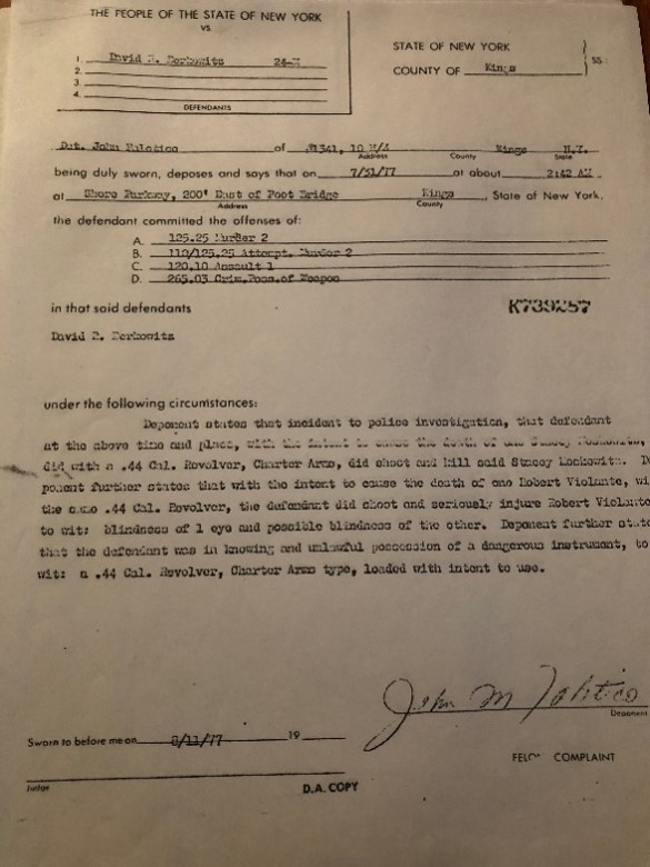 I opened an old friend’s email the other day. It read, “That was a time it was…wasn’t it?” Attached was a copy of the Brooklyn DA’s felony complaint against David Berkowitz, sworn to by Detective John Falotico, dated August 11, 1977.