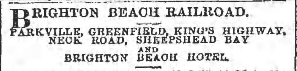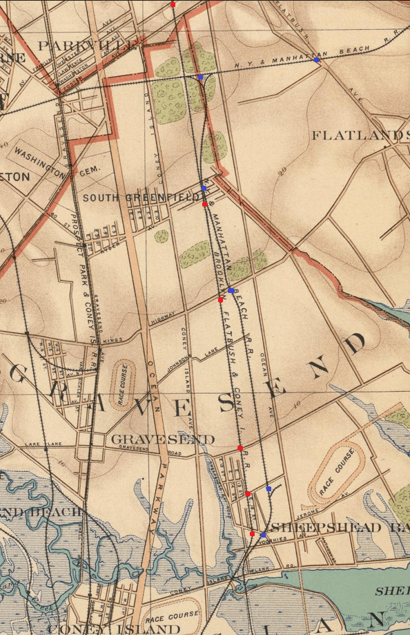 Below you will see a fuller representation of the 1890 map. The Brighton stops are noted by red dots, the MBRR stops by blue. The Brighton trains only stopped “at signal” at Parkville, Greenfield, Kings Highway & Neck Road per this excerpt from a contemporaneous advertisement: