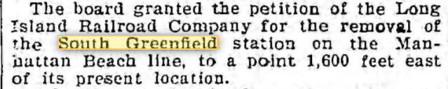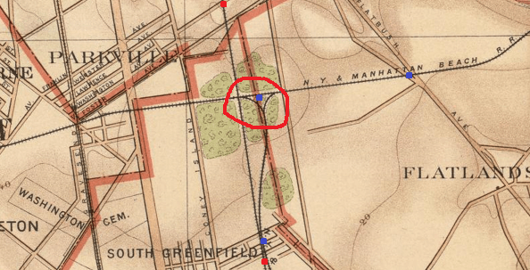 And note the absence of stops at Fiske Terrace (Avenue H) or Manhattan Terrace (Avenue J). They would come later to the Brighton line. Also notice how the MBRR line swerves to the west as it enters South Greenfield, then returns to its eastern path. In 1899, as discussed below, the LIRR attempted to straighten its track bed by moving that station further to the east.