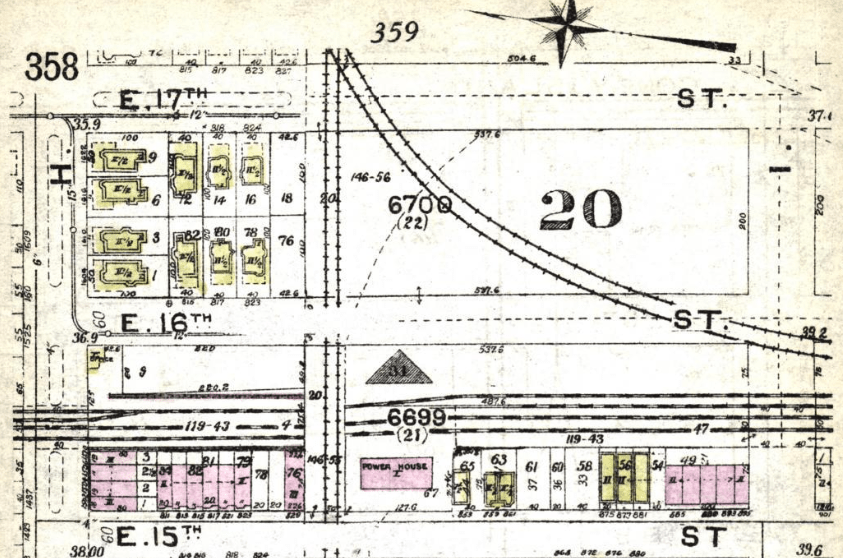The insurance map above (pink=brick & yellow=wood buildings) shows the eastern spur of the MBRR bending to join the embankment just south of Avenue I. The western spur is long gone.