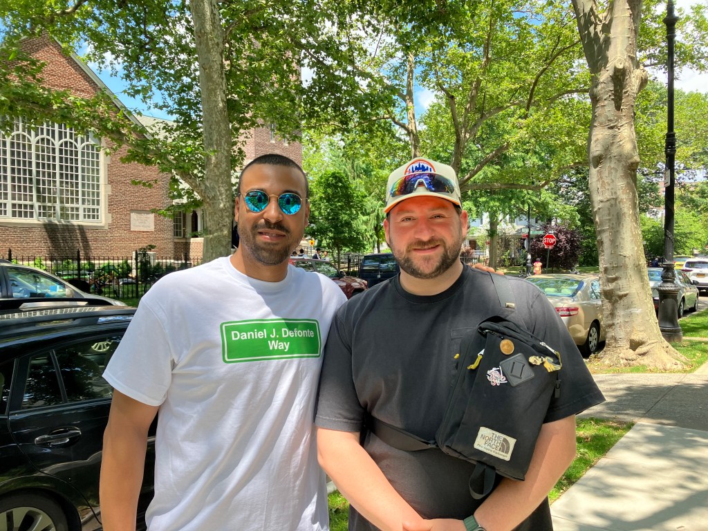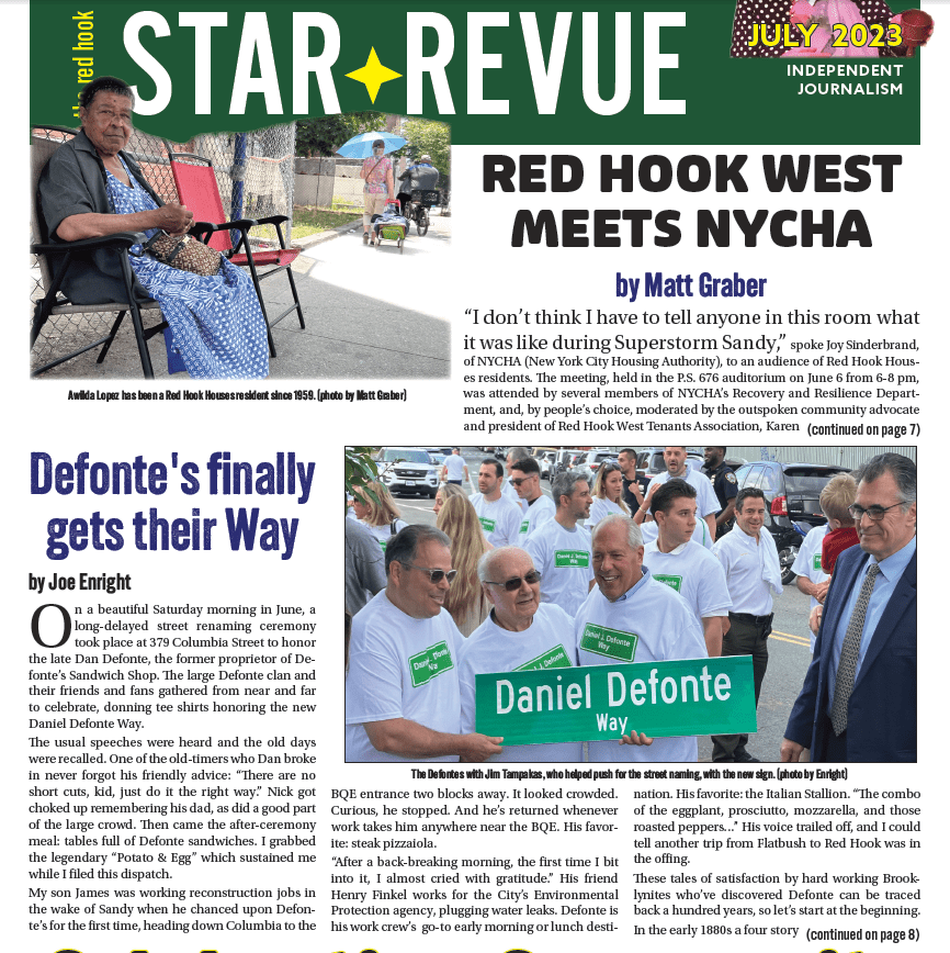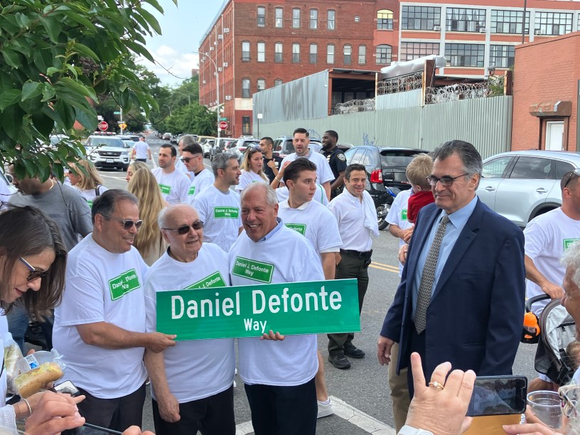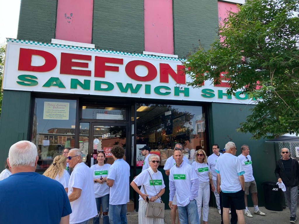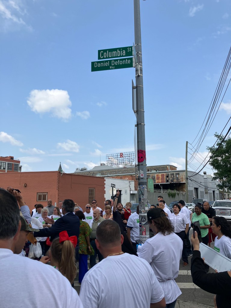 On a beautiful Saturday morning in June, a long-delayed street renaming ceremony took place at 379 Columbia Street to honor the late Dan Defonte, the former proprietor of Defonte’s Sandwich Shop. The large Defonte clan and their friends and fans gathered from near and far to celebrate, donning tee shirts honoring the new Daniel Defonte Way.