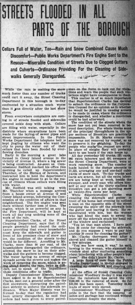 But Asserson’s grand plan languished until Mother Nature came calling on Monday morning, December 15, 1902, when a driving rain in Brooklyn pelted the piles of snow and ice left by a blizzard days earlier. Small sewers and catch basins were overwhelmed, flooding Flatbush Avenue from Prospect Park to Flatlands. All the buildings along Church Avenue, Beverly Avenue, and Cortelyou Road and basements from Windsor Terrace to the north and Parkville to the south were inundated.