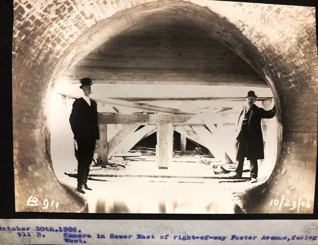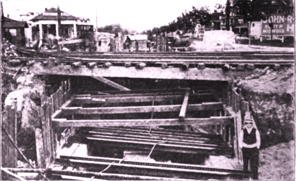 The Foster Avenue sewer consisted of a brick tunnel with an inside diameter of ten feet. But in 1906, the surface Brighton line was depressed into a trench fifteen feet below the street and the Foster sewer had to be lowered to accommodate that railroad bed. Accordingly the sewer for a stretch of 120 feet was flattened by two feet but widened to 14.5 feet so as not to reduce its capacity. The Glenwood sewer was smaller and The Grade Crossing Elimination Project failed to inform the contractor of its existence. As fate would have it, the excavation of the Brighton line began at Glenwood Road where the contractor unexpectedly encountered “a gas pipe, water pipe, sewer and some electric and telephone conduits.” They were all lowered under the roadbed.
