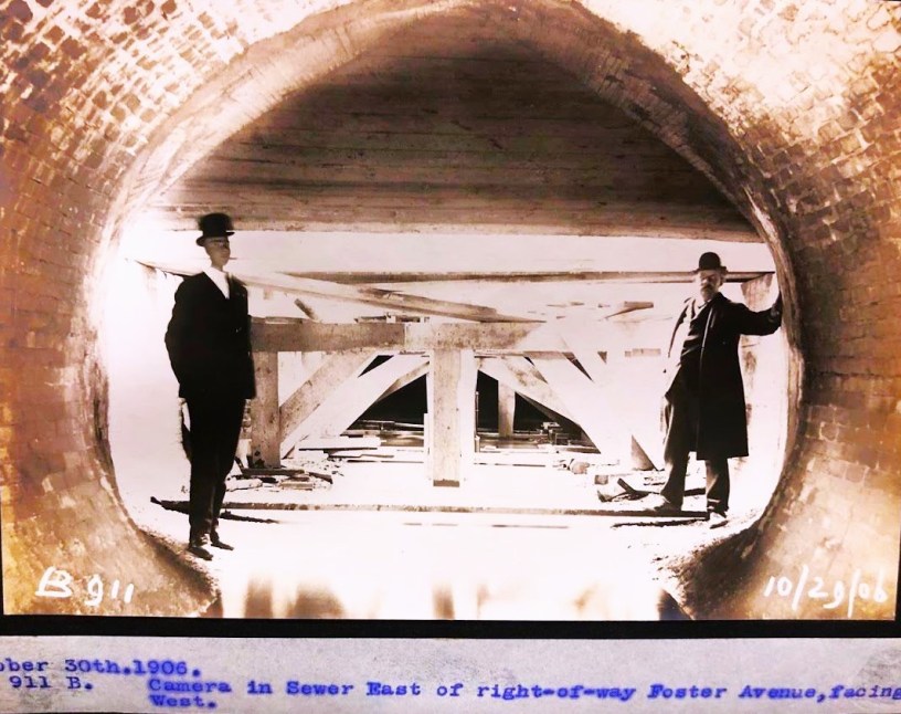 The Foster Avenue sewer consisted of a brick tunnel with an inside diameter of ten feet. But in 1906, the surface Brighton line was depressed into a trench fifteen feet below the street and the Foster sewer had to be lowered to accommodate that railroad bed. Accordingly the sewer for a stretch of 120 feet was flattened by two feet but widened to 14.5 feet so as not to reduce its capacity. The Glenwood sewer was smaller and The Grade Crossing Elimination Project failed to inform the contractor of its existence. As fate would have it, the excavation of the Brighton line began at Glenwood Road where the contractor unexpectedly encountered “a gas pipe, water pipe, sewer and some electric and telephone conduits.” They were all lowered under the roadbed.