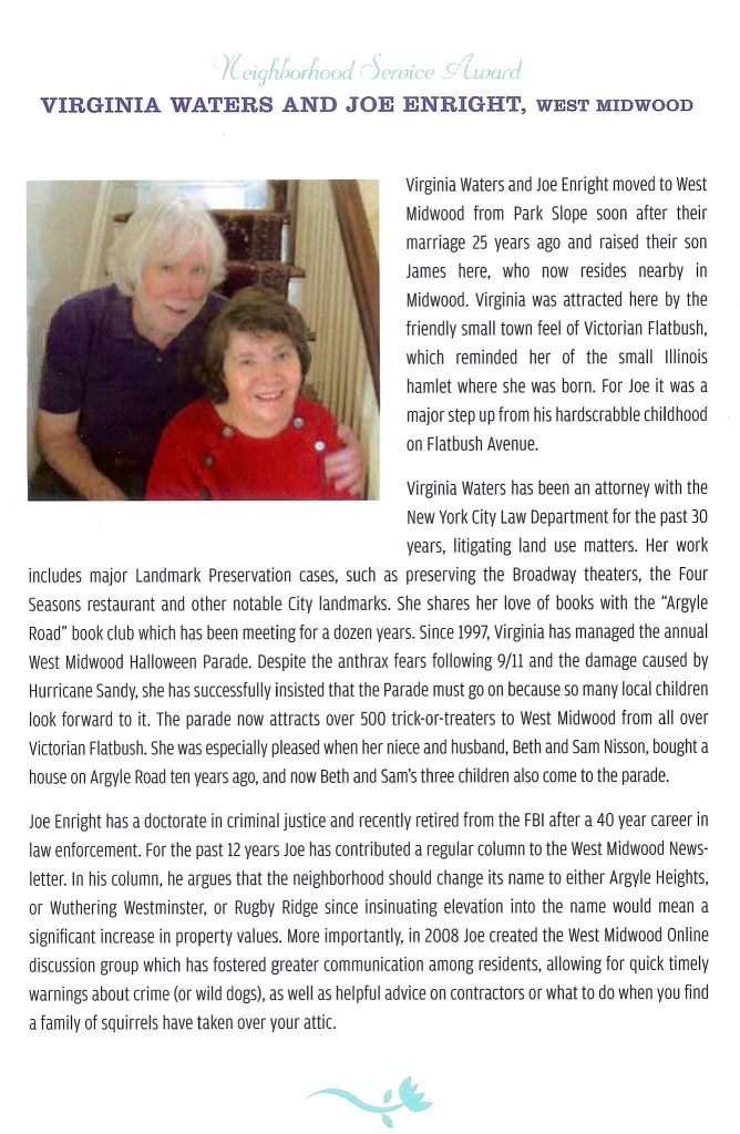 In 1985 she met a law enforcement guy on the subway named Joe Enright and they were married soon thereafter, moving to a small enclave in Flatbush called West Midwood (which is actually north of Midwood), a neighborhood that reminded her of her Midwest home. There, she raised her beloved son James and volunteered to take over organizing the annual Halloween Parade, which hosted 500 happy Flatbush kids, all the while representing New York in notable legal battles, many involving precedential landmarking cases. Former Law Department executive Gabe Taussig summed up her career: “Her claim to fame will be the many significant cases she handled (and won) concerning the City’s landmarks. But there was much more, including significant matters concerning free speech, land use and public health. Throughout, she was enthusiastic and committed to successfully defending the interests of the City. I will, of course, remember her for talents as an attorney. More importantly, however, I will remember her for caring – caring about her work, her colleagues and the people she represented.”