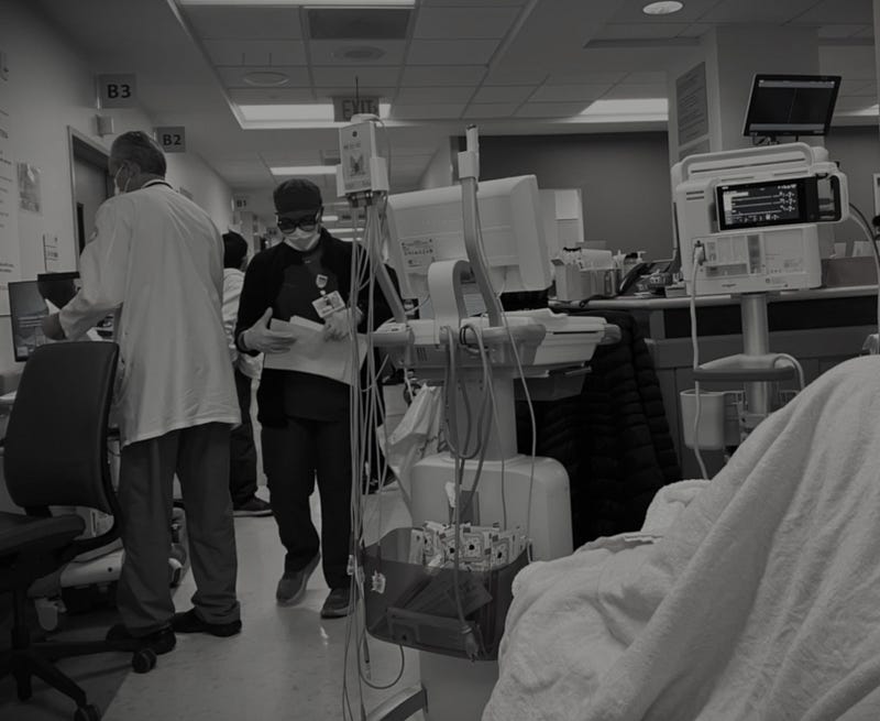 I stood next to her, my frame providing the only privacy she had. Across from us a disheveled prisoner, handcuffed to a gurney, was getting in touch with his inner feelings about the police officer guarding him, while a nearby middle aged gentleman was screaming in Russian something about Tolstoy. Or maybe it was Toy Story. By the wall, out of my reach, was a fire alarm. As the hours passed, how I longed to pull it as a siren wail for every long-suffering soul around us — doctors, nurses, aides, cops, prisoners and patients alike.