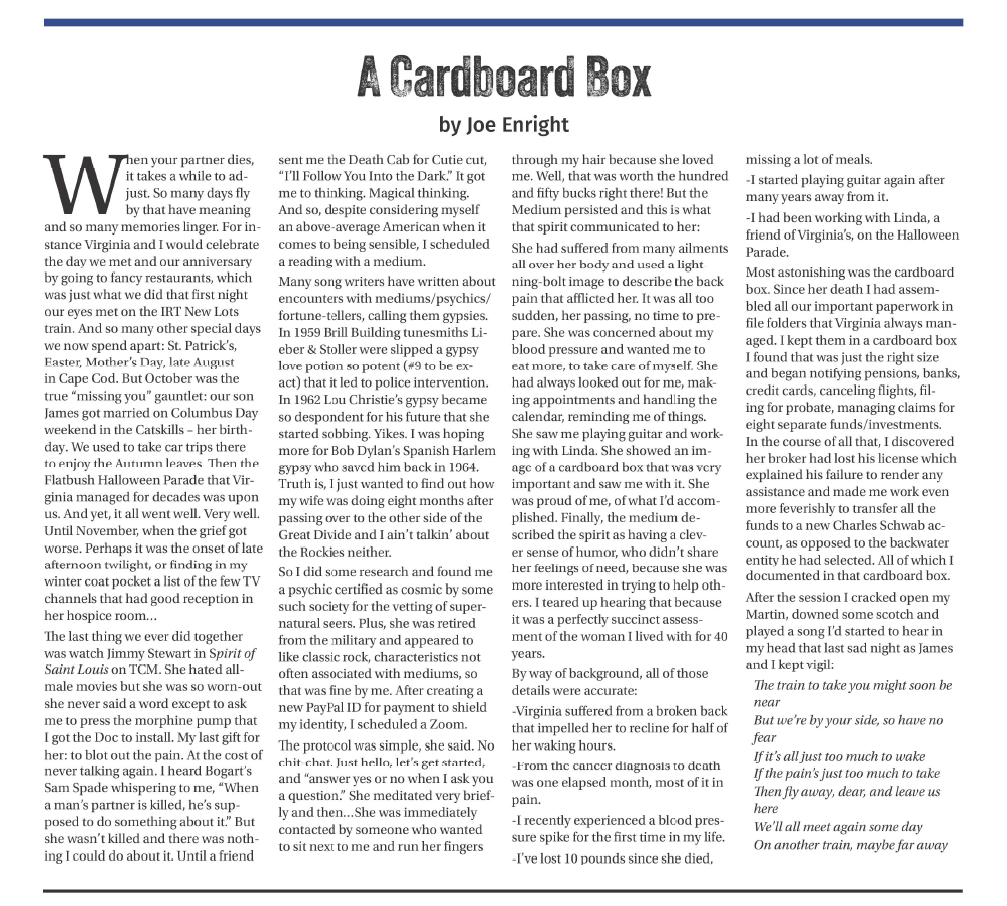She had suffered from many ailments all over her body and used a lightning-bolt image to describe the back pain that afflicted her. It was all too sudden, her passing, no time to prepare. She was concerned about my blood pressure and wanted me to eat more, to take care of myself. She was glad I was playing guitar again and working with Linda. She had always looked out for me, making appointments and handling the finances and the calendar, reminding me of things. She then showed the medium an image of a cardboard box that was very important and saw me with it. She was proud of me, of what I’d accomplished. Finally, the medium described the spirit as having a keen sense of presentation and display, and a very clever sense of humor. She didn’t share her feelings of need, because she was more interested in trying to help others. I teared up hearing that because it was a perfectly succinct assessment of the woman I lived with for 40 years.