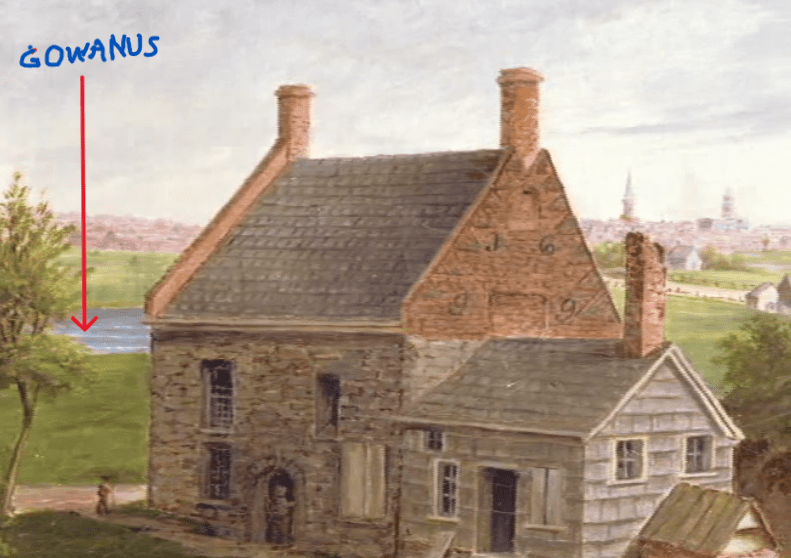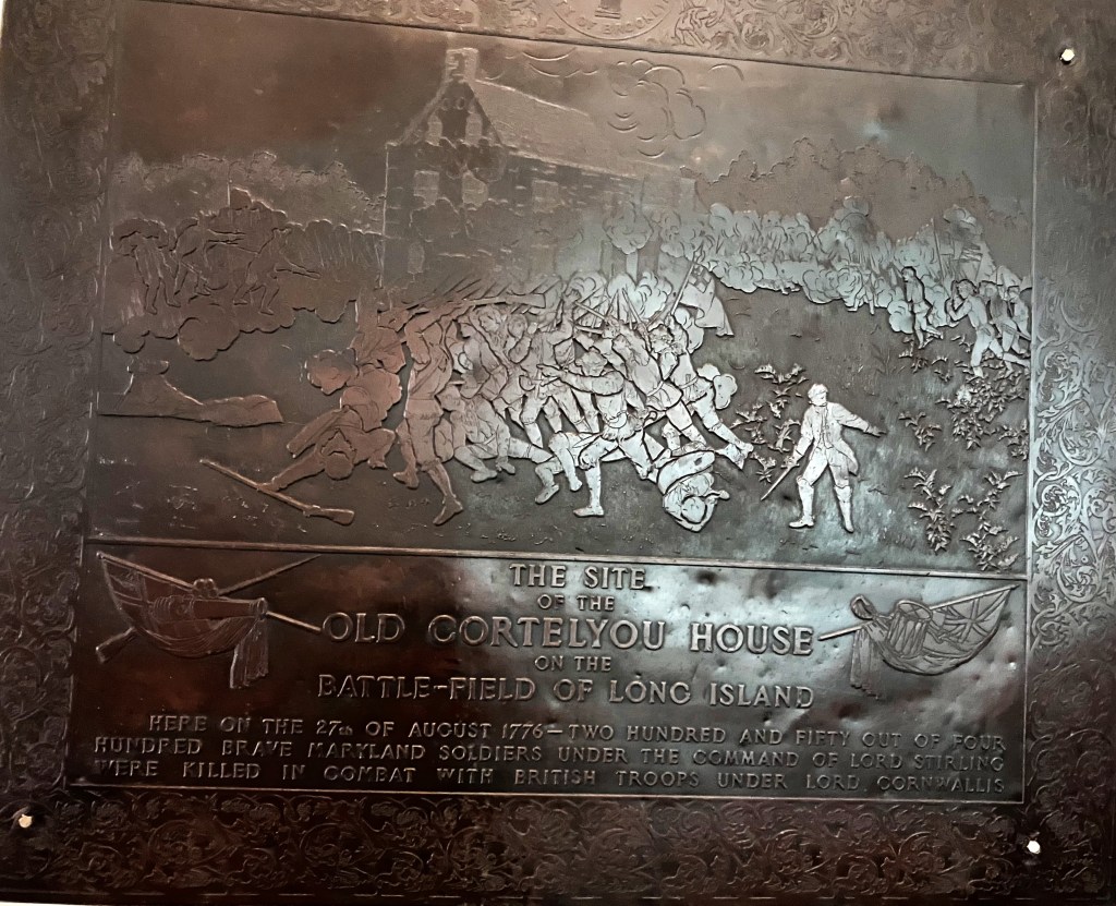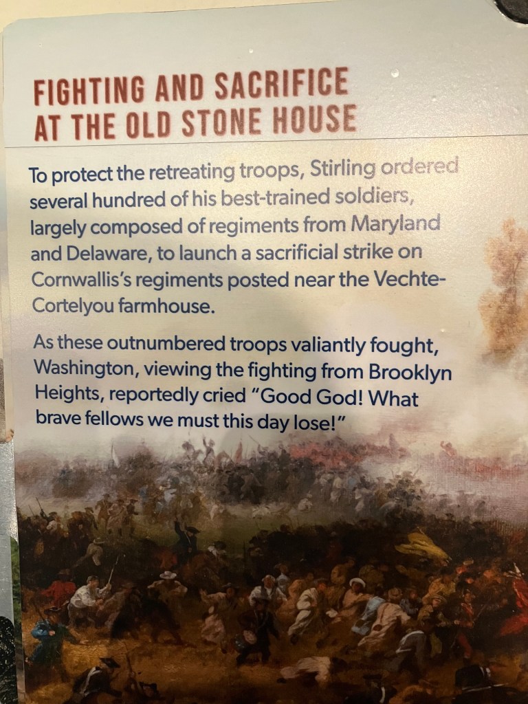 Chet continued. “This regiment from Maryland, 400 guys, were surrounded, see, and the Brits were firing on them from the stoned Cortelyou so one guy said, ‘What the hell, let’s make that house our Alamo!’ And so they charged into volleys of fire, took the house and held off all them redcoats until they were almost all slaughtered or captured. Some swam the Gowanus, the last to do so and survive. Anyway, the British were tired, but happy, so they began celebrating and got drunk and stuff and forgot to keep going and wipe out all the Americans. That gave Washington’s army enough time to retreat and eventually cross over the East River bridges into Manhattan that night where there was much better dining.”